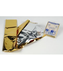 Couverture de Survie Dimensions : 220 x 160 cm. Réduit les échanges thermiques avec l'environnement afin de préserver la température corporelle. Un côté OR et un côté ARGENT