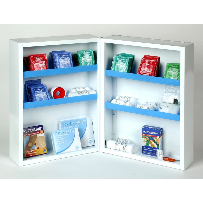 Acier époxy, couleur blanche.Dimensions : 460 x 340 x 180 mm.Poids net vide : 3,5 kg.Serrure et paire de clés, étagères non amovibles, trous pour accrochage mural.10 à 12 personnes.