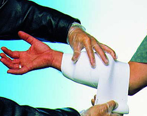 Il faut positionner la compresse avec le carré mousse sur la blessure pour permettre l’absorption du sang, puis la bande élastique est enroulée autour du membre en effectuant une tension sur celle-ci de manière à obtenir une compression suffisante sur la plaie.