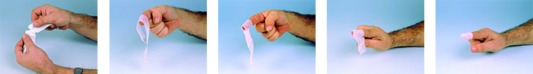 Déposer la bande sur le doigt en laissant déborder de chaque coté, coller la bande sur elle même pour effectuer une compression suffisante sur la plaie et enrouler successivement la bande autour du doigt tout en serrant celle-ci.